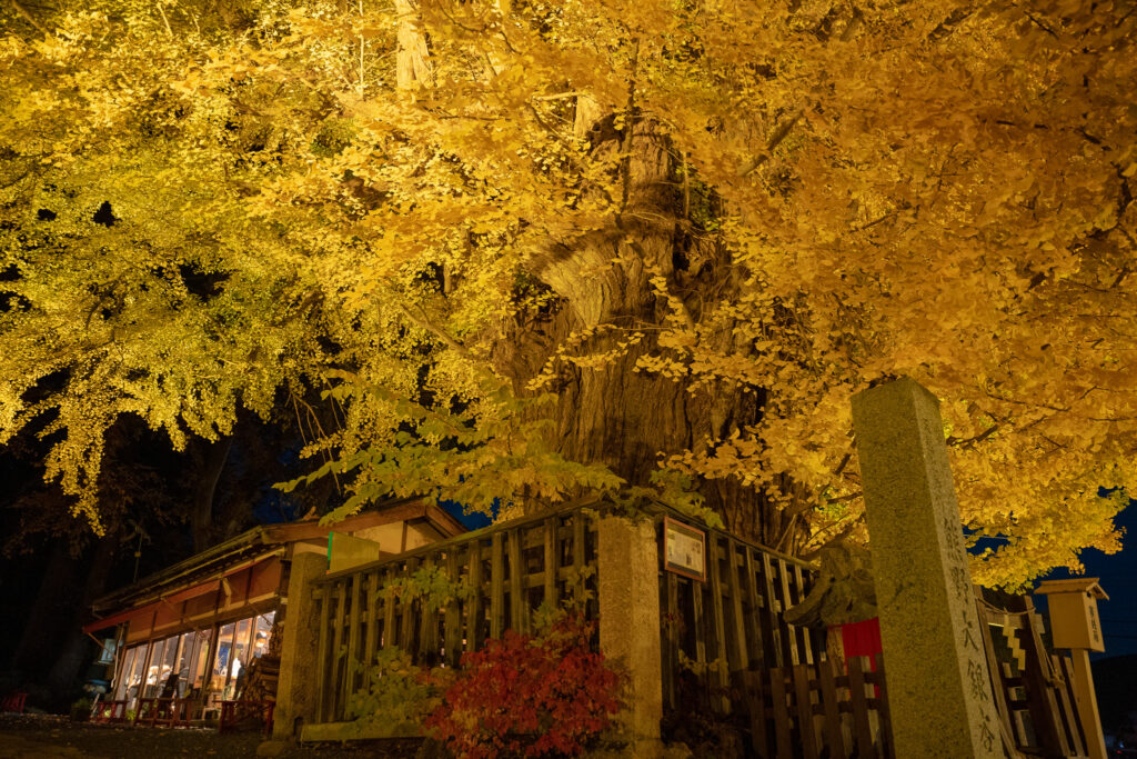 熊野大社では、例年この時期にご神木の大銀杏の黄葉が見頃を迎え、ライトアップとあわせて夜間参拝を行ってまいりました。多くの皆さまにお楽しみいただいておりましたが、事故防止の観点から、やむを得ず中止の判断をいたしました。